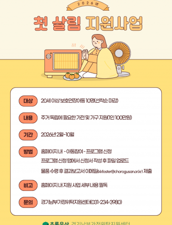 취업 자신감부터 실전 경험까지!이틀 만에 배우고, 해보고, 바로 써먹는 1박 2일 실전 취업캠프비즈니스 매너부터 재무교육, 역할극으로 배우는 직상생활, 헤어·메이크업·이력서 사진 촬영이 포함된 실전 모의면접까지!자립준비청년의 안정적인 사회 진입을 위한 체험형 취업역량 강화 프로그램에 여러분을 초대합니다.가. 사 업 명: 2026 경기도 자립준비청년 취업캠프 JOB:UP나. 일 시: 2026. 2. 7.(토) ~ 2. 8.(일) / 1박 2일다. 장 소: 용인살림교육센터 *수원역 집결 후 전세버스 이동라. 대 상: 경기도 내 자립준비청년 및 보호연장아동 30명 (선착순 모집)마. 참 가 비: 무료바. 참여혜택 - 캠프 수료 시 참여수당 20만 원 지급 - 우수 참여자 10명 취업역량강화 패키지 우선 연계 선발사. 주요 프로그램 - 비즈니스 매너 교육 및 재무교육 - 직상생활을 위한 관계의 기술 - 면접 성공을 위한 자존감 스피치 - 헤어·메이크업 및 이력서 사진 촬영 - 실전 모의면접아. 신청안내: ~2026. 2. 1.(일)자. 신청방법 1) 온라인 신청서 제출(https://form.gle/Tz8mwahw86vMPFg98) 2) 증빙서류 제출(이메일) / 보호종료확인서 1부, 통장사본 1부 / s.r_team@ggjarip.or.kr차. 문 의 처: 031-346-9515(경기도자립지원전담기관 자립준비팀)* 접수 마감일까지 서류 미제출 시 신청이 취소됩니다.* 신청서 내용과 증빙서류가 상이할 경우 참여가 제한될 수 있습니다.
