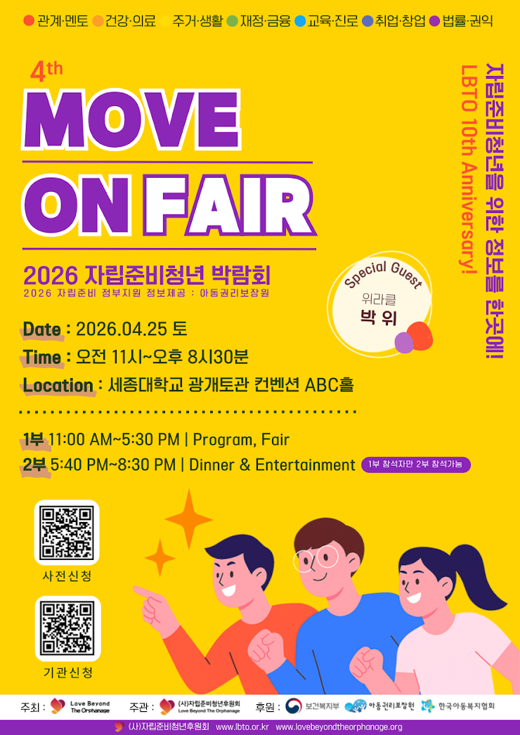 2026 무브온페어 자립준비청년박람회(4th Move On Fair) 페이지 정보 작성자 : 관리자 조회수 : 18회 작성일 : 26-03-13 본문 2026년 제4회 무브온페어 (4th Move On Fair) : 자립준비청년들을 위한 박람회에 여러분을 초대합니다! 1. 일시 : 2026.4.25. 토 11:00am~8:30 pm2. 장소: 서울시 광진구 세종대학교 광개토관 ABC홀3. 주최 : LBTO USA4. 주관 : 사단법인 자립준비청년후원회5. 후원 : 보건복지부, 아동권리보장원, 한국아동복지협회6. 대상 : 자립준비청년 , 예비 대상자(아동복지시설 고등학생), 인솔자- 사전신청 응답기한 : ~ 2026년 4월 18일 (토요일) 서둘러 신청합시다!!!!무브온페어는 무료입장 박람회 입니다.( 자립준비청년 확인 서류 아래 문항에 업로드 필수 )다양한 지원 소식들과 가장 최신의 2026 자립준비청년 지원정보를 듣고 경험할 수 있습니다.간단한 점심과 맛있는 저녁뷔페를 제공합니다. (사전신청 필수)인생네컷 포토부스에서 지인과 즐거운 순간을 간직하세요!다양한 경품추첨 (아이패드, 에어팟, 보스헤드폰 등)과 푸짐한 참가선물이 기다리고 있습니다.유명연예인(박위, 김기리, 이윤정 소프라노)의 축하메세지와 공연 등 진행이 있습니다.- 참석자 전원 5만원 상당의 선물 증정 (상황에 따라 변경될 수 있음) + 사전신청자에게는 추첨을 통해 50명에게 선물을 드립니다. + 인기있는 부스는 행사에 일찍 참석하는 순서대로 참가자격이 주어집니다 ( 퍼스널컬러 등 )+ 수도권을 제외한 지방 참여자에게 왕복 교통비를 제공(10만원 한도)합니다.(교통비 영수증은 행사 종료 후 만족도조사에 첨부하여 제출 / 계좌번호, 보호종료확인서 등 제출)1. 박람회 참가 신청링크: https://forms.gle/E9MHWY45sBUYAcrC92. 박람회 협력기관 신청청크 : https://forms.gle/XvPWYCHzfn2nYYAg7 (협력기관 에서도 많은 관심 바랍니다 )★ 문의 : http://pf.kakao.com/_fYzxfG/friend (플러스친구 - lbto 검색) 메일 : lbtokorea@gmail.com, 담당자 전화번호 010-9754-2016발열, 기침 등 호흡기 증상이나 전염성 질환이 의심되는 분은 행사 참여를 제한하오니 양해 부탁드립니다. 목록 다음글[초록우산X키움증권] 자립준비청년지원사업 '스픽 프리미엄 플러스 연간 이용권 지원' 26.03.05