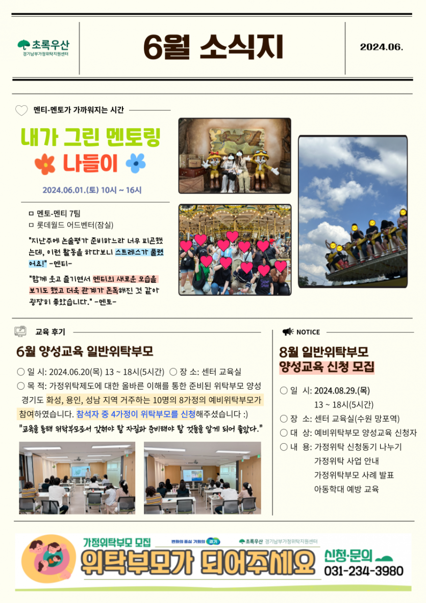 [행사내용] 2024년 6월 센터 소식 페이지 정보 작성자 : 관리자 조회수 : 6,590회 작성일 : 24-07-09 본문 안녕하세요~ 경기남부가정위탁지원센터 입니다.6월 센터의 소식을 전달 드립니다 :) 목록 이전글2024년 7월 센터 소식 24.08.08 다음글2024년 5월 센터 소식 24.06.25