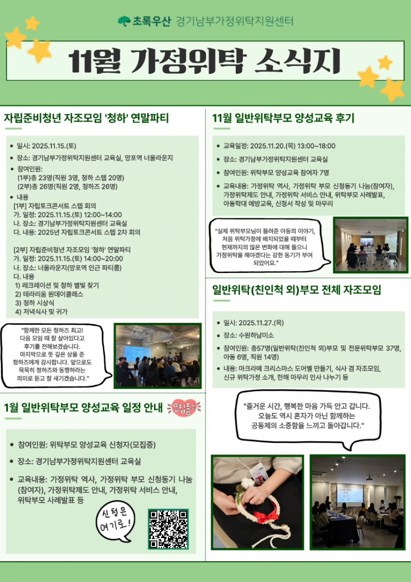 [행사내용] 2025년 11월 센터 소식 페이지 정보 작성자 : 관리자 조회수 : 16회 작성일 : 25-12-23 본문 안녕하세요. 경기남부가정위탁지원센터입니다.2025년 11월 센터 소식지 전달드립니다. 감사합니다. 목록 다음글2025년 10월 센터 소식 25.11.13