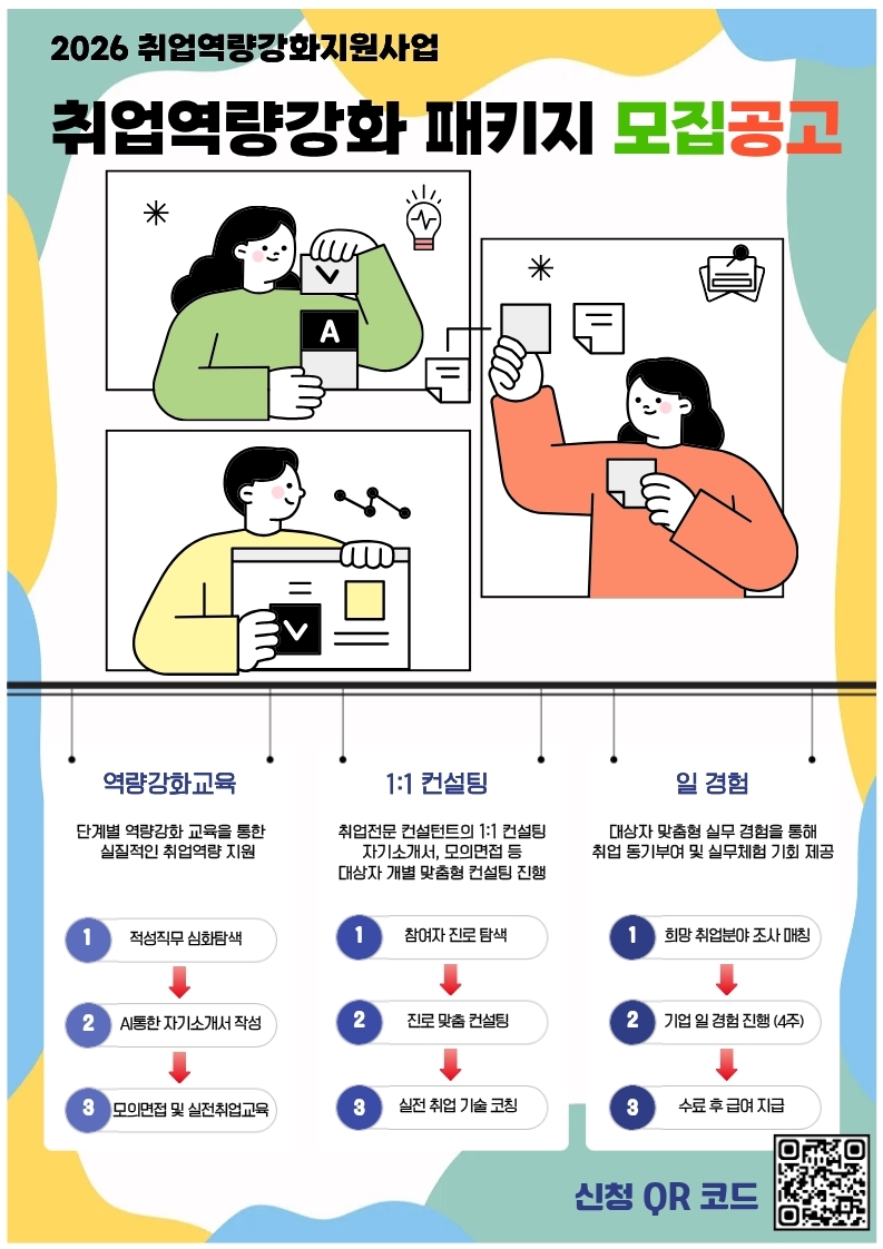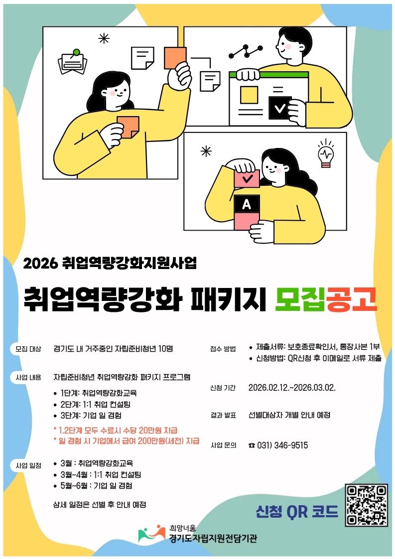 [경기도자립지원전담기관] 2026년 자립준비청년 취업역량강화 지원 패키지 참여자 모집 안내 페이지 정보 작성자 : 관리자 조회수 : 14회 작성일 : 26-02-26 본문 <2026년 「자립준비청년 취업역량강화 지원 패키지」참여자 모집 안내>1. 모집기간: 2026.02.12.~2026.03.02.2. 모집대상: 현재 경기도에 주소를 두고 있는 자립준비청년3. 신청방법: 홍보 포스터 내 QR코드를 통한 신청서 제출4. 지원내용: 단계별 역량강화 교육, 1:1 개별 컨설팅 지원 및 일 경험 프로그램 목록 다음글[CJ도너스캠프] 2026년 CJ도너스캠프 아카데미 26.02.25