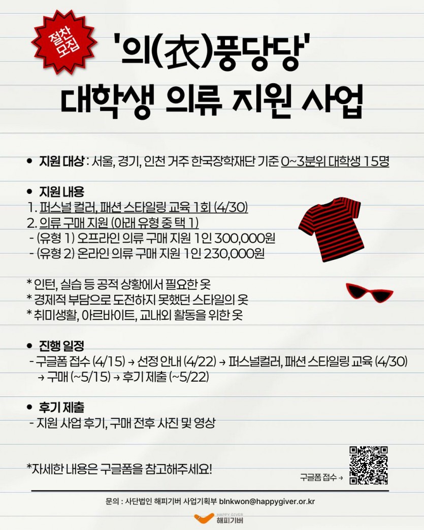 [해피기버] '위풍당당' 대학생 의류 지원 사업 페이지 정보 작성자 : 관리자 조회수 : 116회 작성일 : 26-04-01 본문 안녕하세요. 이웃에게 행복을 전하는 해피기버 입니다. 해피기버에서 저소득 대학생을 대상으로 의류 지원 사업을 실시하고자 하니, 많은 관심과 신청 부탁드립니다.*사업 취지- 경제적 부담을 겪는 저소득 대학생들에게 의류 구매 비용을 지원하여 실질적인 생활 안정에 기여- 퍼스널 컬러와 스타일링 교육을 통해 자기 탐색의 기회를 제공함으로써, 경제적 한계로 시도하지 못했던 자신만의 스타일에 도전하고 사회 진출 과정에서 당당하게 역량을 발휘할 수 있도록 도움 *지원 대상 : 서울, 경기, 인천 지역 거주 한국장학재단 기준 0~3분위 재휴학생 15명*지원 내용 1. 패션 스타일링 및 퍼스널 컬러 교육 1회 - 4/30(목) 15:00-18:00 서울 인근 대면 강의, 불참 시 의류 구매 지원 제외 2. 의류 구매 지원 (아래 유형 중 택 1) - (유형 1) 오프라인 의류 구매 지원 1인 300,000원 3명 - (유형 2) 온라인 의류 구매 지원 1인 230,000원 12명* 인턴, 실습, 교생 등 공적 상황에서 필요한 옷* 경제적인 부담으로 도전하지 못했던 스타일의 옷* 취미생활, 아르바이트, 교내외 활동을 위한 옷*진행 일정 (기관 사정에 따라 변동될 수 있음) 구글폼 접수(4/15) → 선정 안내(4/22) → 패션 스타일링, 퍼스널 컬러 교육(4/30) → 의류 구매(~5/15) → 후기제출(~5/22)*후기 제출 - 지원 사업 후기 (양식 제공) - 의류 구매 전후 사진 및 영상 *신청 방법 - 구글폼 제출 : [해피기버] '의(衣)풍당당' 대학생 의류 지원 사업 (~4/15) - Google Forms *문의 : 해피기버 사업기획부 blnkwon@happygiver.or.kr 목록 다음글[경기도자립지원전담기관] 2026년 상반기 단기자립체험 참여자 모집 공고 26.03.24